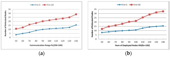 As mentioned before, the number of relocated nodes RN is the primary concern of the node failure restoration with node mobility. While the network is deployed with a fixed number of nodes (DN = 100), the number of relocated nodes increases about 10% when Fm is 5, but that of Fm = 10 increases much more obviously. However, when the communication range is set as 100, RN grows fleetly with various DN in both scenarios. Figure 16a,b indicates that when the number of failed nodes increases, the number of relocated nodes grows greatly in dense networks. Again, since the recovery process may move many residual healthy nodes to replace the failed nodes and almost rebuild the network topology, it is unnecessary to restore the network connectivity if too many nodes fail simultaneously in the network. When Fm = 5, the probability that there are neighboring failed nodes is close to zero, so the number of relocated nodes is between 5 and 15 as shown in the Figure 16a,b.