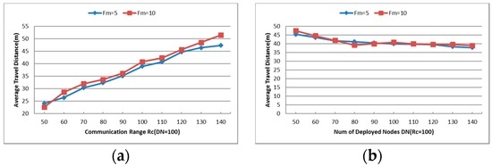 The average travel distance TD is also an important index for node failure restoration algorithm, and the results are shown in Figure 17a,b. With the increase of the communication range , the average travel distance of each node rises rapidly as the number of deployed nodes is fixed. However, the situation is different when the value of is fixed. The average distance that each node travels in the recovery process remains around 40 m as the number of deployed nodes increases. As mentioned above, the primary factor that affects the recovery is the distance between the nodes, i.e., the communication range of each node influences the relations of each node significantly. Thus, different values of make the results quite different from each other.