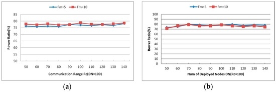 Figure 10b captures the Cooperative Communication Power Ratio (PR) of each simulation with different values of and DN. Again, the results are the mean value over multiple simulations as mentioned above. As shown in Figure 10b, the PR of most simulations is around 75% even with different and DN. In sparse network topology (i.e., the DN is small), the number of neighbors of each node varies greatly and the PR increases as the increases. When the number of deployed nodes increases, the neighbors of each node increase. According to Equation (3), the required power for CC-link mainly depends on the distance between the source and destination nodes. When the neighbors are enough for establishing the CC-link, the required power ratios will hold at some certain values (around 75% as shown in Figure 10b). As the CSFR-M algorithm is expanding from CSFR to avoid its disadvantage, the PR metric of CSFR-M is similar to that of CSFR.