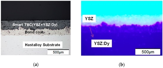 The microstructure of the phosphor-doped TBC sample was examined using micro metallographic microscope (SZ61, Olympus, Tokyo, Japan), as shown in Figure 1a. The interfaces between the Hastalloy substrate and the bond coat, and between the bond coat and the TBC can be clearly seen. Here, the YSZ serves as the thermal barrier layer and YSZ:Dy serves as the temperature sensing layer.