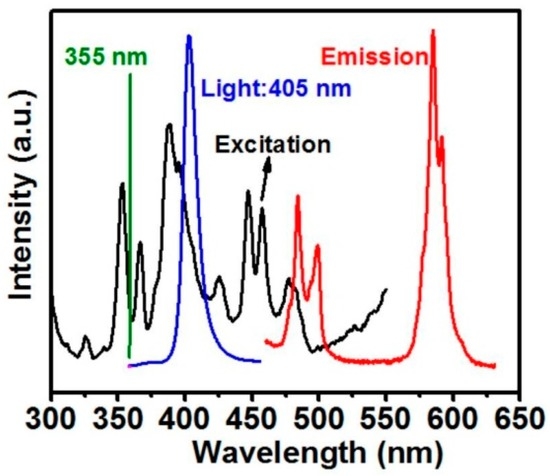 The microstructure of the sample was also examined under the excitation of a 405 nm diode laser (OEM-HD-405, CNI Laser, Changchun, China) to clearly show the sensing layer, which is indicated by the purple ribbon under the white YSZ in Figure 1b. In the current study, the thickness of the YSZ:Dy layer was about 40 μm for all samples. A total of four samples were made with topcoat thicknesses of 0, 80, 180 and 300 μm. The Raman spectrum of Dy-doped YSZ was examined using a Raman spectrometer (LabRAM HR Evolution, Horiba, Kyoto, Japan). Figure 2 shows the absorption spectrum (in black) and the emission spectrum (in pink) of YSZ:Dy. The strongest absorption peak appears at 390 nm, and the strongest emission peak occurs at 584 nm. Previous studies have commonly used the 355 nm Nd:YAG laser as exciting source for YSZ:Dy, which is actually less efficient then the 405 nm light source being used in the current study. Based on the emission spectrum, a band-pass filter of 550–625 nm was selected for the collection of the luminescent signal.