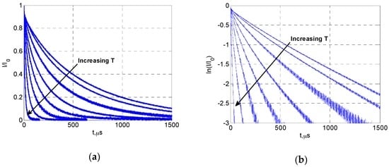 Decay curves of YSZ:Dy at different temperatures: (a) normalized intensity; (b) logarithm of normalized intensity.