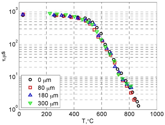 Figure 5 presents the luminescent decay curves of YSZ:Dy at different temperatures (from 400 to 750 °C). The decay lifetime decreases rapidly as temperature rises, and linear relations are clearly seen between t and log(I/I0), showing the feature of a single-exponential decay. The lifetime values were obtained from the decay curves using a linear curve-fit as mentioned earlier. The temperature calibration results from the room temperature up to about 900 °C are presented for all samples in Figure 6. It can be seen that the luminescent lifetime did not change with the topcoat thickness, as expected. The lifetime value was around 800 µs at room temperature, and it showed weak dependency on temperature from room temperature to about 500 °C (τ ≈ 500 µs at 500 °C). Then the temperature sensitivity suddenly increased, and a linear relation was observed between T and log(τ). The lifetime dropped to about 5 µs at 800 °C. The current results of Dy-YSZ agree well with the data from previous studies [18,19].