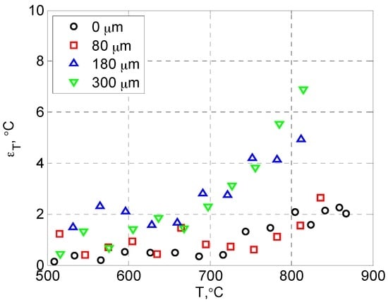 The measurement uncertainties within the effective sensing range (T > 500 °C) are presented separately in Figure 7 for clarity. The uncertainty was relatively constant for T < 700 °C, and then increased rapidly with temperature due to the reduced signal level (strong thermal quenching) at high temperatures. Also, the uncertainty generally increased with the topcoat thickness due to stronger signal attenuation (from light scattering and absorption) for both the excitation and the emission light as they travelled through the top YSZ layer. As a result, the upper limit of temperature sensing was reduced as the topcoat thickness increased.