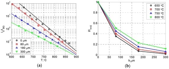 Effects of YSZ topcoat thickness on SBR: (a) temperature vs. SBR; (b) topcoat thickness (h) vs signal attenuation (I/Ih=0).