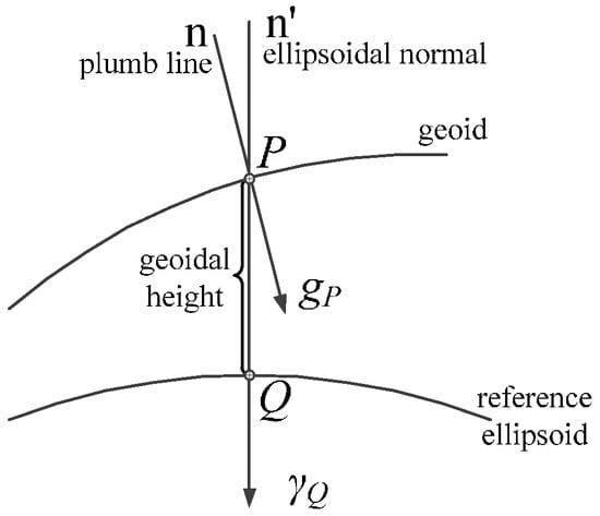 As Figure 1 shows, a point P on the geoid is projected onto the point Q on the surface of the ellipsoid by means of the ellipsoidal normal. The gravity disturbance vector (GDV) is defined as the difference between the gravity vector g at P and the normal gravity vector γ at the same point P []: