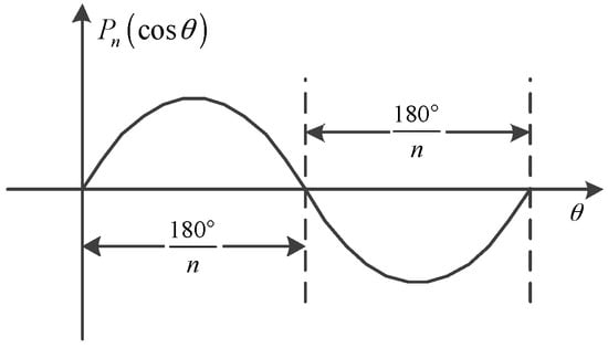 The quantity of value of zero is at most n and 2n in the directions of θ and λ, respectively. The interval of these zeros in both directions is equal to 180°/n, i.e., the spatial resolution. That means the highest frequency of Tn is n/2π. Figure 2 shows one period of function Pn(cosθ) in the direction of θ.