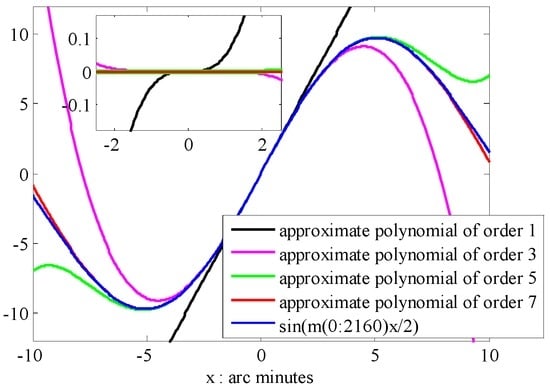 This difference oscillates at the frequency m/4π, which will vary with the quantity of m. The highest frequency is at the point m = 2160, in the case of EGM2008. Thus, the level of nonlinearity for this difference is determined by the sum of sin(mΔλ/2), where m [0, 2160]. Then, we turn our focus to the grid interval Δλ. If it is less than the model’s resolution, i.e., Δλ < ΔΨ, the value of mΔλ/2 will be less than π/2 at m = 2160. That means the sine function will be a small value that could be simply treated as a linear or low order polynomial, when Δλ = ΔΨ/2. For the sum of sin(mΔλ/2), all of the calculated angles are less than π/4. Assuming the coefficients of sine functions to be a series of normalized random data in the range of [−1, 1], the sum of sin(mΔλ/2) is shown in Figure 3 coupled with its fitted polynomial functions of different order. The inset of Figure 3 shows the differences between the regressed functions and the basic function.