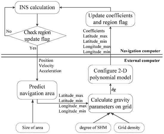 As it shown, our navigation system comprises the navigation computer and the gravity computer [,]. The online modeling method provides PM for dynamic INS in real-time and global navigation. To update PM for varying navigation areas, the method will be aided by the external gravity computer. Once the vehicle is close to the boundary of the current area, the coefficients of PM and next applicable area will be updated in the external computer. The modeling scheme is implemented as follows: