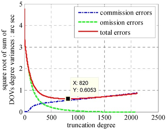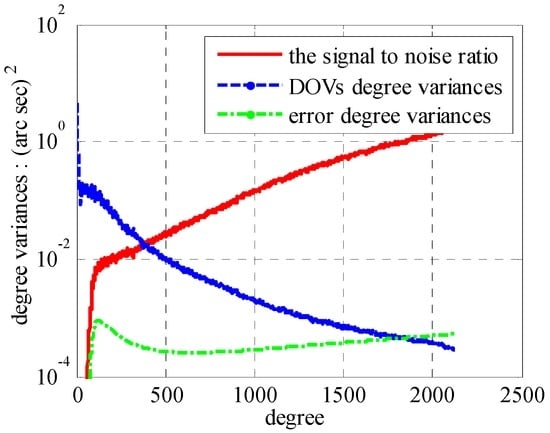 The SHM as the base model has two types of errors: commission errors and omission errors. The commission errors are due to incorrectly estimating coefficients of the model, and the omission errors are due to truncation errors of the short wavelength variations of the gravity potential which are not modeled [,]. The degree variances of DOVs and error degree variances are used to describe these errors, whose expressions are as follows: