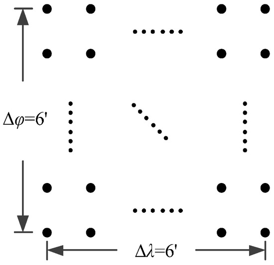 In spherical harmonic analysis and synthesis, the surface of the Earth is gridded as numbers of subblock Δθ × Δλ []. We describe the disturbing potential values on a global grid as follows: