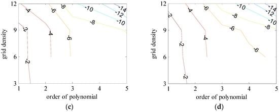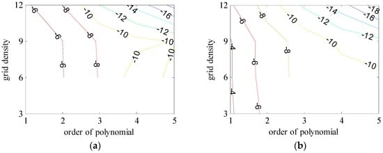 The basic data chosen here is DOVs from two 6′ × 6′ areas in Section 3.2, which are calculated by the base model. We fit first- to fifth-order PMs to the grid DOVs, whose number is k × k. In the test, the value of k is set as 3, 6, 9 and 12 respectively. The performances of PMs are tested through results of ten million points in each test area. The descriptive statistics (lg(RMS)) of the polynomial approximate results minus basic data are reported in Figure 8.