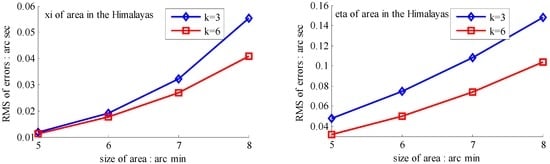 In both test areas, the approximation errors show the same level of accuracy for subregions whose sizes are equal to half of the SHM’s resolution. Specifically, using a second-order polynomial produces the RMS-errors of 10−2 arc·s in smooth area and 10−1 arc·s in rugged area. A third-order polynomial reduces the approximation errors to 10−3 and 10−2 arc·s, respectively. As the size is reduced, the approximation accuracy improves.