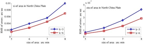 To illustrate the theory above, two test areas are chosen, one in the North China Plain and another in the Himalayas. Based on EGM2008 and maximum degree 2160, 900 and 360, basic values of DOVs are generated on dense grids with 50 × 50 points. In addition, the database is obtained on three subregions of each test area, sizes of which are corresponding to 15′ × 15′, 6′ × 6′ and 2.5′ × 2.5′. A remark made here that we discuss the horizontal components of GDV only, because the vertical channel of INS normally requires some external aiding, such as barometric altitude [].