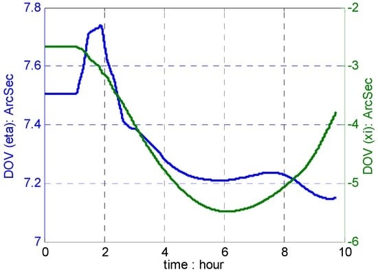 Actually, a 0.1 arc·s DOV induces a position error on the order of several meters per hour []. Therefore, to involve a larger applicative area of the fitted polynomial, we set this 0.1 arc·s DOV as a permission index of model approximation. Further, this index could theoretically satisfy the accuracy demand of a modern high-precision navigation system.
