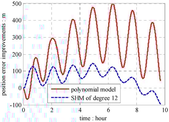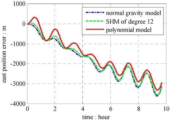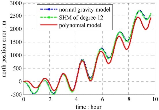 According to results in Figure 13, Figure 14 and Figure 15, the proposed polynomial model has the best performance compared with the NGM and SHM of degree 12. Relative to NGM, the maximum value of position error improvements is 500 m during the ten hours travel when navigation scheme is compensated by the polynomial model, while, it is 152 m in the navigation scheme compensated by the SHM of degree 12. Therefore, the effectiveness of the online gravity polynomial model is verified in that it could improve the position error of ship-borne INS by about ten percent.
