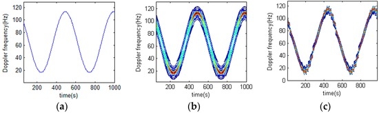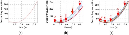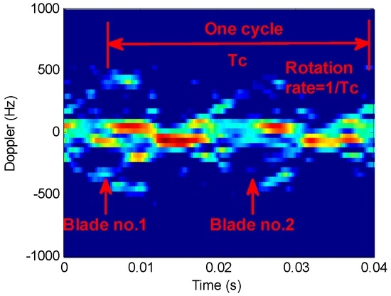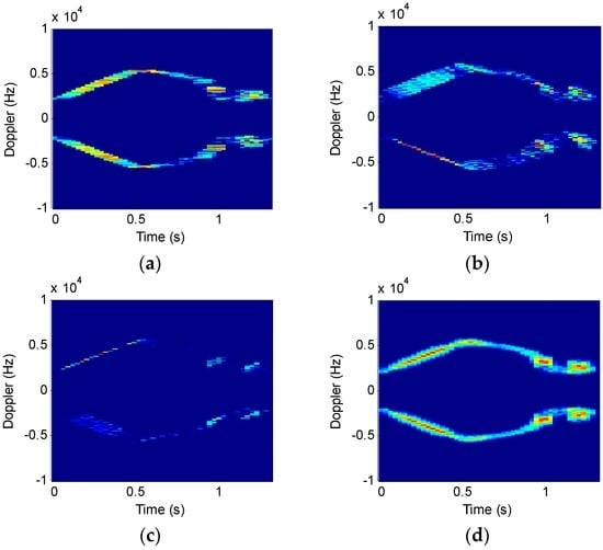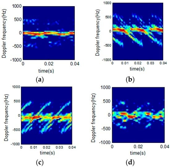 For a complicated movement target with a translational movement, the target itself or the structure it carries may also have rotation, precession, nutation, or other micro movement features. These features could be used to help determine the “identity” of the target. The feature of micro-Doppler was firstly found in a coherent laser radar system. With a wavelength ranging from 1/100,000 to 1/10,000 of conventional radar’s wavelength, laser radar provides higher phase/frequency sensitivity, which is beneficial to the measurement and analysis of fine movement features of the targets [1,2,3,4,5,6,7,8,9]. In 2006, Chen et al. introduced micro-Doppler into conventional radar and pointed out that Doppler signals of the target echoes are mostly multi-component time-varying signals. In order to obtain micro movement features of the target, the most straightforward approach is to use the time spectrum analysis [1,2]. Time-frequency algorithms currently used by researchers mainly include linear time-frequency technique and second order Cohen’s class time-frequency technique. Linear time-frequency distribution has no cross terms but its time-frequency resolution is low. By contrast, second-order Cohen class time-frequency distribution offers a higher time-frequency resolution but its downside is the cross terms being tainted by multi-component signals [4,10,11,12,13,14,15,16,17,18].