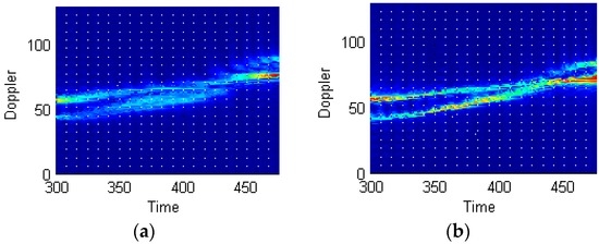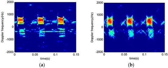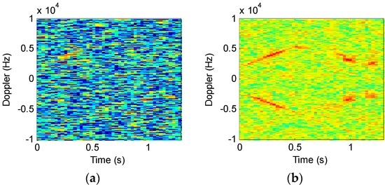 The comprehensive analysis of data given in Figure 8 may be processed by direct accumulation of multiple sub-time-frequency spectra. For sub-time-frequency spectra obtained from a strong clutter background, image processing techniques—such as smoothing, filtering, expansion, and etching—may be used for preprocessing before superposition processing.