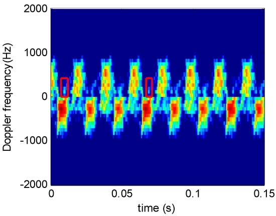 Unlike Figure 12d and Figure 17b, the increased number of blades makes it impossible to determine clearly the number of time-frequency curves from Figure 19. Alternately, a blade (shown in red boxes) on Figure 19 is found to have time-frequency features not identical to other blades. This is because the target attitude has some influence on the blades, which are located differently in space. Consequently, the micro-Doppler signals generated by different blades may have slight differences. Thus, we can use the same blade recurring cycle to estimate blade number.