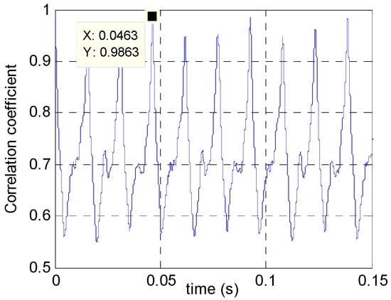 Figure 20 shows the correlation coefficient after image registration on Figure 19 by Equation (16). With a template size of 5 × 5, it is found that blade recurring cycle is 0.0463 s and the rotation frequency is 22 per second. After processing the frequency value using the method reported in [2], the number of available blades is estimated at three, consistent with the actual number. For comprehensive validation, the same experiment and method were applied on different blades, all resulting in accurate estimation of the blade number n.