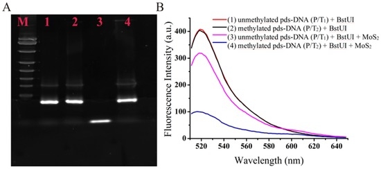 (A) Gel image about the methylation-sensitive cleaved process of BstUI in non-denaturing polyacrylamide gel electrophoresis. Lane M: DNA marker; Lane 1: unmethylated pds-DNA (P/T1); Lane 2: methylated pds-DNA (P/T2); Lane 3: unmethylated pds-DNA (P/T1) + BstUI; Lane 4: methylated pds-DNA (P/T2) + BstUI. (B) Fluorescence emission spectra of the DNA detection and methylation analysis strategy under different conditions: (1) unmethylated pds-DNA (P/T1); (2) methylated pds-DNA (P/T2); (3) unmethylated pds-DNA (P/T1) + BstUI + MoS2; (4) methylated pds-DNA (P/T2) + BstUI + MoS2.