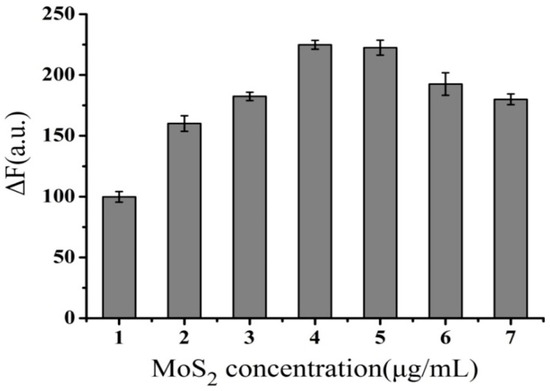 Dependence of the relative fluorescence change (∆F = F1 − F2) on different concentrations of MoS2 nanosheets. Error bars represent the standard deviation of three experiments.