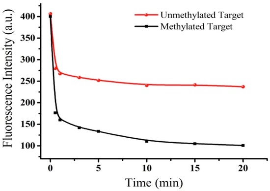 The kinetic behavior of FAM-probe fluorescence quenching in the presence of MoS2 with the unmethylated target (red) and methylated target (blank), respectively.