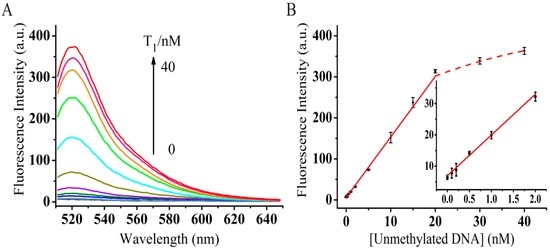 Firstly, based on the high fluorescence quenching property and discrimination ability between ss-DNA and ds-DNA of MoS2 [19], the unmethylated target DNA (T1) (a fragment of P16 promoter) could be detected in this homogeneous sensing system. Figure 4A exhibited the fluorescence spectra of 20 nM FAM-probe DNA (P) in the presence of different concentrations of unmethylated target DNA (T1) from 0 to 40 nM under the optimized conditions. It is noted that fluorescence could still increase as the concentration of T1 exceeded that of FAM-probe DNA (P). That’s because that the redundant T1 has a stronger interaction with MoS2 compared to the cleaved double-stranded DNA of P/T1, and replaces the few adsorbed cleaved ds-DNA on MoS2 [19].