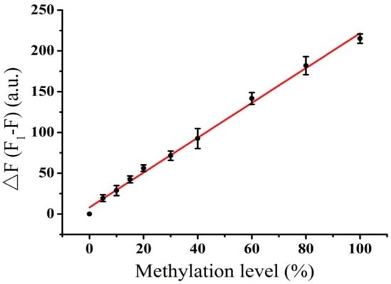 The linear relationship between ∆F (Y) and methylation level (X) ranging from 0% to 100% (5%, 10%, 15%, 20%, 30%, 40%, 60%, 80%, and 100%). Error bars represent the standard deviation of three experiments.