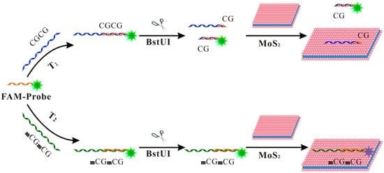 20 nM FAM—labeled probe DNA(P) were hybridized with unmethylated target DNA (T1, 20 nM) and methylated target DNA (T2, 20 nM), respectively. The mixture were heated to 95 °C for 10 min, and then slowly cooled down to room temperature to ensure the formation of partial duplex DNAs (pds-DNAs), including the unmethylated pds-DNA (P/T1) and the methylated pds-DNA (P/T2). Then the pds-DNAs were cleaved by 20 U/mL BstUI endonuclease at 60 °C for 2 h in 50 µL 1 × CutSmart buffer. Finally, the mixture pds-DNAs were mixed with 450 µL solution of 4 μg/mL MoS2 for 10 min, respectively.