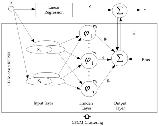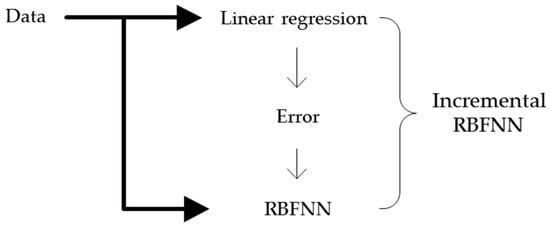 The overall design process of the incremental RBFNN is shown in Figure 3. The development of the incremental RBFNN consists of two phases. First, we design the linear regression (LR) phase, which is treated as the preliminary global model representing the linear part of the data. Next, the modeling error obtained by the LR is compensated by the local RBFNN. In the design of RBFNN, the hidden layer is constructed using fuzzy granulation realized via CFCM clustering.