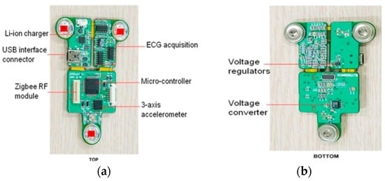 The sensor board consisted of a three-axis accelerometer, three ECG electrodes, a voltage converter, and a Li-ion charger. Two quasi-triangular flexible PCB boards are combined in the sensor, as shown in Figure 2. The MI is the summation of the motion indices along all the three axes x, y, and z. It can detect the movement acceleration signal in the range of −6 g to 6 g. The agility was examined using physical training protocols, such as the zigzag run, a 20 m shuttle run, the Burpee test, and a side-step test. The movement detection was strongly correlated to conventional agility tests (R2 = 0.80–0.91). The results verified its applicability to the evaluation of the exercise state of the users. The HR detection was designed based on the use of a bandpass filter for R-wave detection. Motion artifacts were incurred and led to an error rate that was less than 2% with a commercial stress ECG monitor (CASE System, GE Medical, Westborough, MA, USA). The sensor node included 3.3 V Li-ion rechargeable batteries with a continuous operation period of two hours. The distances for transmission can achieve more than 400 m in an open field using the ZigBee telecommunication. The technical details of the sensor design can be found in a previously published study [].
