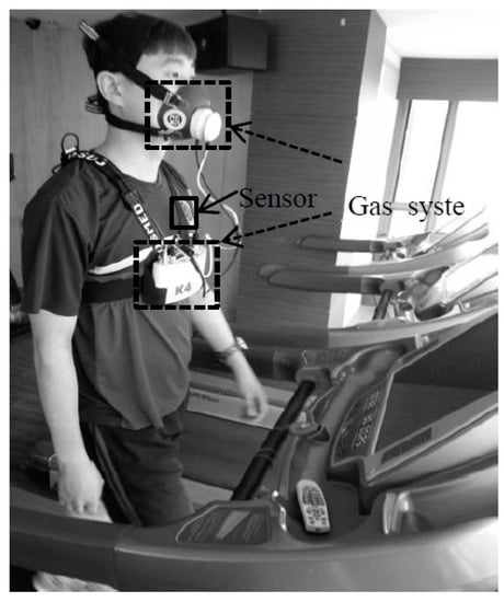 The participants were tested on a treadmill using the submaximal Bruce protocols in the laboratory, as shown in Figure 4. The treadmill’s initial velocity was set at 9.72 m∙s−1, and with a 10% gradient. The incline of the treadmill was increased by 2% at three-minute intervals. The participants walked and ran until they felt exhausted. For men, the test time lasted approximately 12 min, whereas for women the test time lasted approximately 9–10 min. The HR and MI were recorded in real-time by the patch-type sensor. The VO2 and EE were measured by the gas system. The physical characteristics of the subjects are listed in Table 1.
