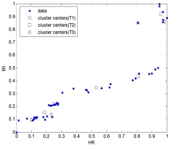 The centers can be generated by fuzzy c-means clustering based on each of the contexts. Given “p” contexts and “c” centers per context, c × p clusters can be obtained. Figure 6 shows the cluster centers generated by the three contexts and the three clusters. The cluster centers can be the same as those of the RBFN hidden layer. Therefore, the RBFN model can be constructed as follows: HR and MI are used as the inputs of the input layer, nine units as the hidden layer—based on the number of contexts—and the clusters, and the EE as the output layer.