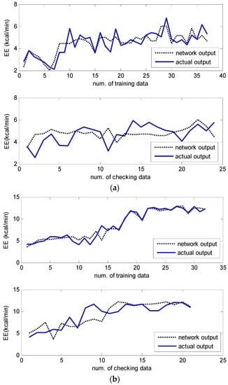 The final goal is to realize the accurate estimation of EE under free-living conditions. After the laboratory tests, all of the participants were encouraged to complete four exercise tests in the open field. The first was comfortable walking, the second jogging, the third was a quick walk, and the last was slow running. Each test course was performed in approximately two minutes in an oval track field. The experimental procedure was designed to progress as naturally as possible. The structure of the RBFNN thus constituted the reference basis of the experimental laboratory test. The data obtained for walking, jogging, fast walking, and slow running, respectively consisted of 157, 60, 63, and 99, sample pairs. The prediction performance is shown in Figure 7. As indicated in the Figure 7, the experimental results revealed that the proposed network showed good prediction and generalization performance in all cases of normal walking, brisk walking, slow running, and jogging, for the training and testing datasets, respectively. Table 4 lists a comparison of the RMSE data collected using the RBFNN and LM methods.