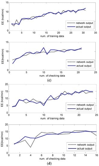 (a–d) Prediction performance of energy expenditure by the incremental RBFNN. (a) Normal walking in school playground; (b) Brisk walking in school playground; (c) Slow running in school playground; (d) Jogging in school playground.