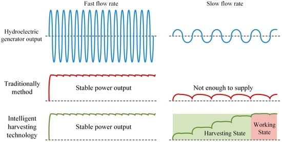 In this study, we use an intelligent hydroelectric energy harvesting technology to power a CO sensor without a battery (COSWOB), whether the flow in the pipe is stable or not. Figure 1 illustrates an output power comparison of the traditional and proposed methods, with fast and slow flow rates.