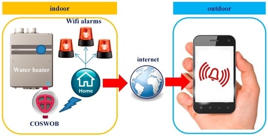 Our strategy to prevent CO poisoning by monitoring the CO level by a COSWOB is shown in Figure 2. The COSWOB is installed in a cold water inlet of a natural gas water heater, which is located on a balcony, and the Wi-Fi alarms are placed in another location, such as a bathroom, living room, and bedroom. The COSWOB monitors the CO level in ambient conditions, which is generated from the gas water heater, and transmits these accumulated data to an intelligent gateway through the Bluetooth low-power (BLE) protocol. When the CO level reaches a dangerous level, the COSWOB alarm sounds loudly. Additionally, an application which is run in the intelligent gateway will send a notification to activate Wi-Fi alarms when the COSWOB senses CO over the threshold value in the air. The Wi-Fi alarms can generate louder sounds to alert users in the bathroom and other people in the living room or bedroom. Meanwhile, the intelligent gateway also sends a warning message to smartphones of their family members outdoors in case users miss this louder alarm.