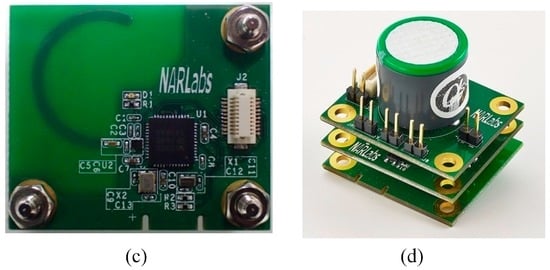 Photographs of the printed circuit board of (a) the power module; (b) the sensor module; (c) the microcontroller module; and (d) the complete assembled stack.