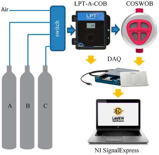 The COSWOB is calibrated and tested using a homemade gas sensor calibration system where known concentrations of CO gas are introduced from the cylinders, as shown in Figure 6. This method works by introducing gas of known concentrations (25, 50, 100 ppm) then performing a check with a gas reference sensor which can be used to calibrate the COSWOB. In order to calibrate the COSWOB, its output signals were also compared to the output signals of a reference sensor (LPT-A-COB, Critical Environment Technologies Canada Inc., Delta, BC, Canada), which provides a high level of accuracy for the measurement of 0–100 ppm CO with 4–20 mA of output. A precision 150-ohm resistor with a 0.1% tolerance is connected to the output terminal of the LPT-A-COB reference sensor. The voltage drop across the precision resistor is measured by data acquisition (DAQ) (USB-6281, National Instrument, Austin, TX, USA), and NI SingnalExpress is used to analyze acquisition data.