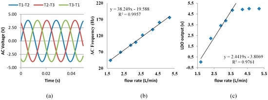 (a) The output signals of three loops of the stator at a flow rate of 1.7 L/min; (b) Frequency of the sinusoidal waveform of the one of three loops of the stator as a function of the water flow rate; (c) The output voltage of the LDO regulator as a function of the water flow rate.