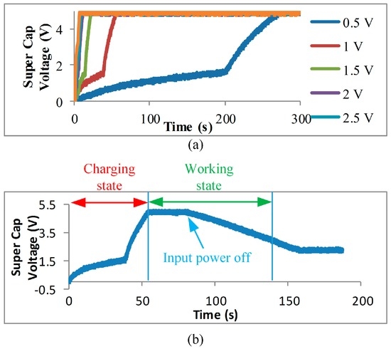 The intelligent hydroelectric energy harvesting technology in this work composes an energy harvesting circuit, an energy storage element, a battery threshold control circuit, and DC/DC converters. The input can be any non-stable voltage but should be greater than 330 mV. A chart of charges of the supercapacitor with different input voltages is shown in Figure 8a. We experimented with six different input voltages: 3 V, 2.5 V, 2 V, 1.5 V, 1 V, and 0.5 V. The charging times of the output voltage that can reach 5 V are around 7 s, 9 s, 12 s, 23 s, 56 s, and 275 s, respectively. The charge curve has two slopes of charging rate because the energy harvesting circuit has two kinds of charging methods: a trickle current charge and a main boost charge. Morever, the output voltage of micro-hydropower generator is around 1 V (flow rate = 1.9 L/min) and the voltage of the energy storage element can be charge to almost 4.6 V. In this condition, a microcontroller module (wireless communication function) and sensor module (sensor function) cannot work under a supply voltage of around 1 V when we only used the micro-hydropower generator to supply the COSWOB without a power module. Figure 8 shows the sensing system operation process with 1 V of charging and discharging. The sensing system turns to a working state when the voltage of the supercapacitor is greater than 4.5 V, and it turns off when the voltage of the supercapacitor is lower than 2.3 V. In this work, we use the 0.1-F supercapacitor that can still work around 75 s when the hydroelectric generator is turned off.