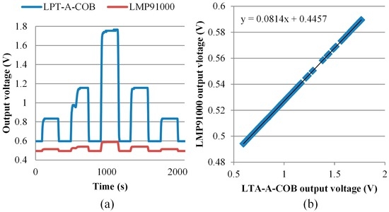 The sensor module (Figure 3b) supports both types of electrochemical sensors (three leads and two leads gas sensors), but three-lead electrochemical CO sensor (CO-AF, Alphasense, Essex, UK) is only used in this study. A potentiostat is required for maintaining appropriate bias potential between the reference and the counter electrodes of the electrochemical gas sensor. We adapt a programmable analog front end (AFE), LMP91000 (Texas Instruments, Dallas, TX, USA), to provide a bias between reference and counter electrodes and convert into a voltage from the output current of work electrodes. An analog-to-digital converter (ADC161S626, Texa Instruments, Dallas, TX, USA) samples the output voltage of the LMP91000 and converts this analog voltage to a digital value for further data gathering by a microcontroller.