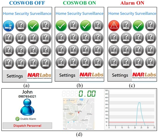 Screenshots of the main pages of the application run in the intelligent gateway, various states: (a) COSWOB OFF; (b) COSWOB ON; and (c) alarm activated; (d) Screenshot of the information of the COSWOB.