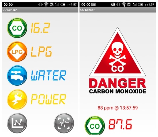 We also developed a mobile application for monitoring the COSWOB. The mobile application is available on the Android operating system. Users or their family members can monitor the status of the COSWOB in real-time through mobile devices, such as a smartphone and a tablet. The mobile application listens for the data transmitted from the intelligent gateway. For visual displays, we typically use a numerical indicator and a chart. Moreover, when the detected CO level reaches a dangerous level, the mobile application will alert the user with siren sounds, and a warning sign and the occurrence time will be displayed on the screen to notify users. The warning sign lasts until users dismiss it.