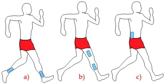 Figure 3 illustrates some examples of places to install smart sensors according to their application. The places where sensors are installed will influence both results and the type of analysis to be performed, such as (a) installing a sensor on each ankle to analyze movements and range of movements; (b) installation of two sensors (thigh and tibia) to analyze the knee angle during gait execution; (c) a sensor installed in the lumbar can analyze hip movements, according to the pace [23,24,25,26,27,28,29,30].