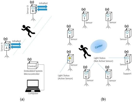 Regarding physical evaluations, running evaluation systems can be exemplified with sensors and timers, which in parallel with physical examination sensors (fatigue, heart rate, etc.) are transmitted to a signal processing center, as exemplified by Figure 5 [56]. The system displays the running time between the towers. With this given time and the distance between towers, it is possible to calculate, along with other parameters, physiological power, fatigue index, among others [15]. Figure 5a exhibits a smart sensor topology for collecting time in continuous running between infrared or optical sensors (A and B), and it can be sprints or even laps. Additionally, the system shown in Figure 5b is used for agility tests, composed by many sensor towers (is showed 8 towers), where the measured value is the time taken for the athlete to trigger the active sensor and return to the center, which is indicated by lighting the tower to be triggered. Both systems has a central tower with a embedded system microcontrolled to collect data, store them and also enable them to transfer to a computer.