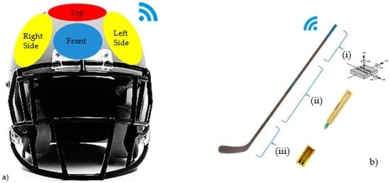 In addition to safety equipment, in hockey there is also the fusion of smart sensors on the stick, which analyze the movements of the athletes with the stick, the force of the strike, and the position of the hands on the stick [72]. The fusion of three sensors installed on the stick can be used (Figure 6b): inertial sensors at the top of the stick to analyze the movements of the stick in the hands of the athlete (i region); linear potentiometers to identify the hand position on the stick of the athlete (ii region); and lastly, strain gauge to analyze the deflection of the stick at the time of the strike (iii region), thus monitoring the force at which the puck is released [72].