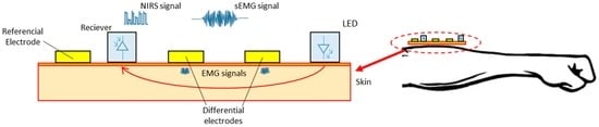- Guo, W.; Sheng, X.; Liu, H.; Zhu, X. Development of a Multi-Channel Compact-Size Wireless Hybrid sEMG/NIRS Sensor System for Prosthetic Manipulation. IEEE Sens. J. 2016, 16, 447–456. [Google Scholar] [CrossRef]