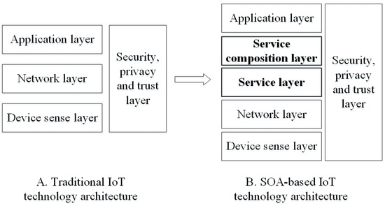 SOA-based IoT technology architecture (Figure 1) introduces the service layer and the service composition layer into the traditional IoT technology architecture between the network layer and application layer [4]. The service layer encapsulates the function of various heterogeneous devices as services, and the service composition layer composes the the device services and traditional Web services to meet the needs of complex application. In the SOA-based IoT technology architecture, services contains two kinds of service: the device service and the traditional Web services. The device service is embedded in a physical device, and can provide real-time data to reflect the state of the physical world. In addition, the device service is always deployed in the resource-constrained device (such as the limited computing, storage capacity, bandwidth and battery).